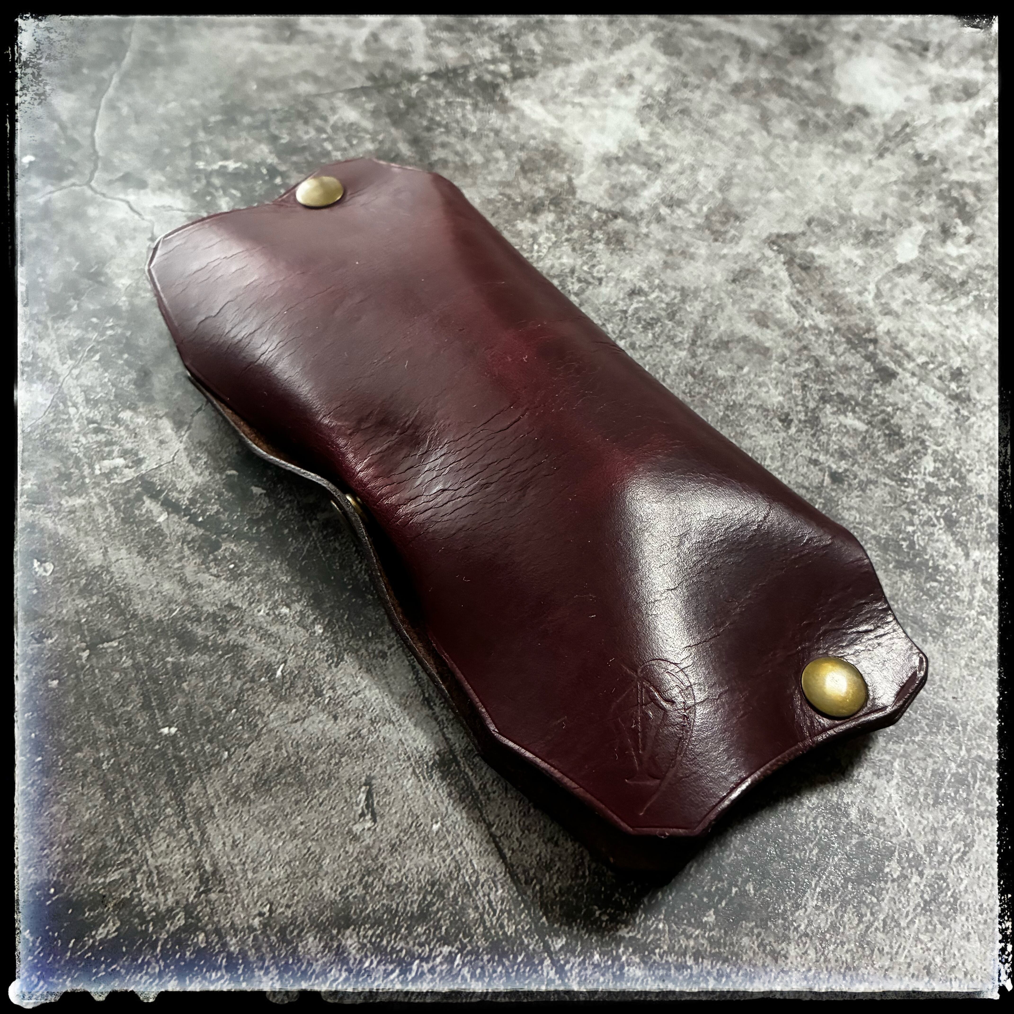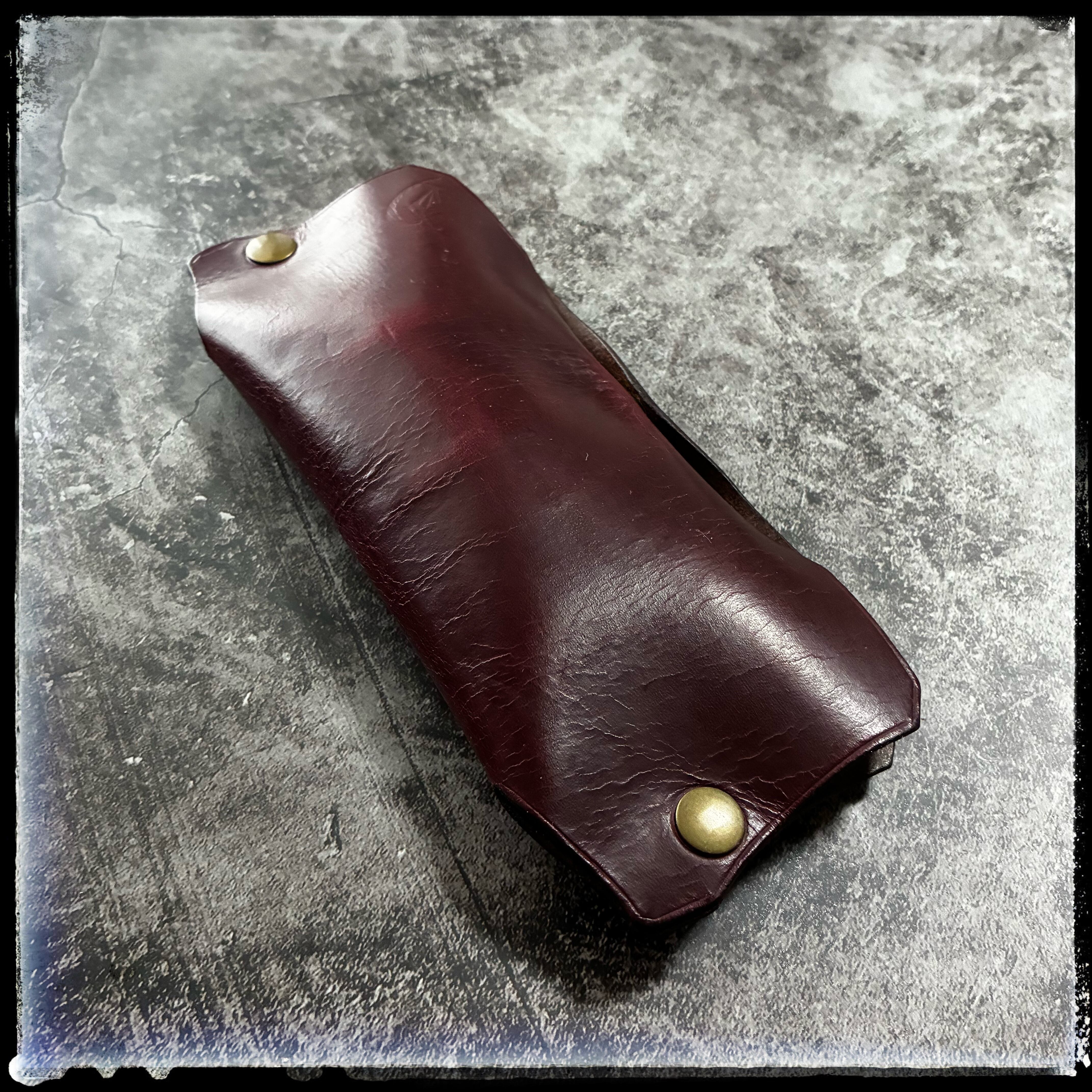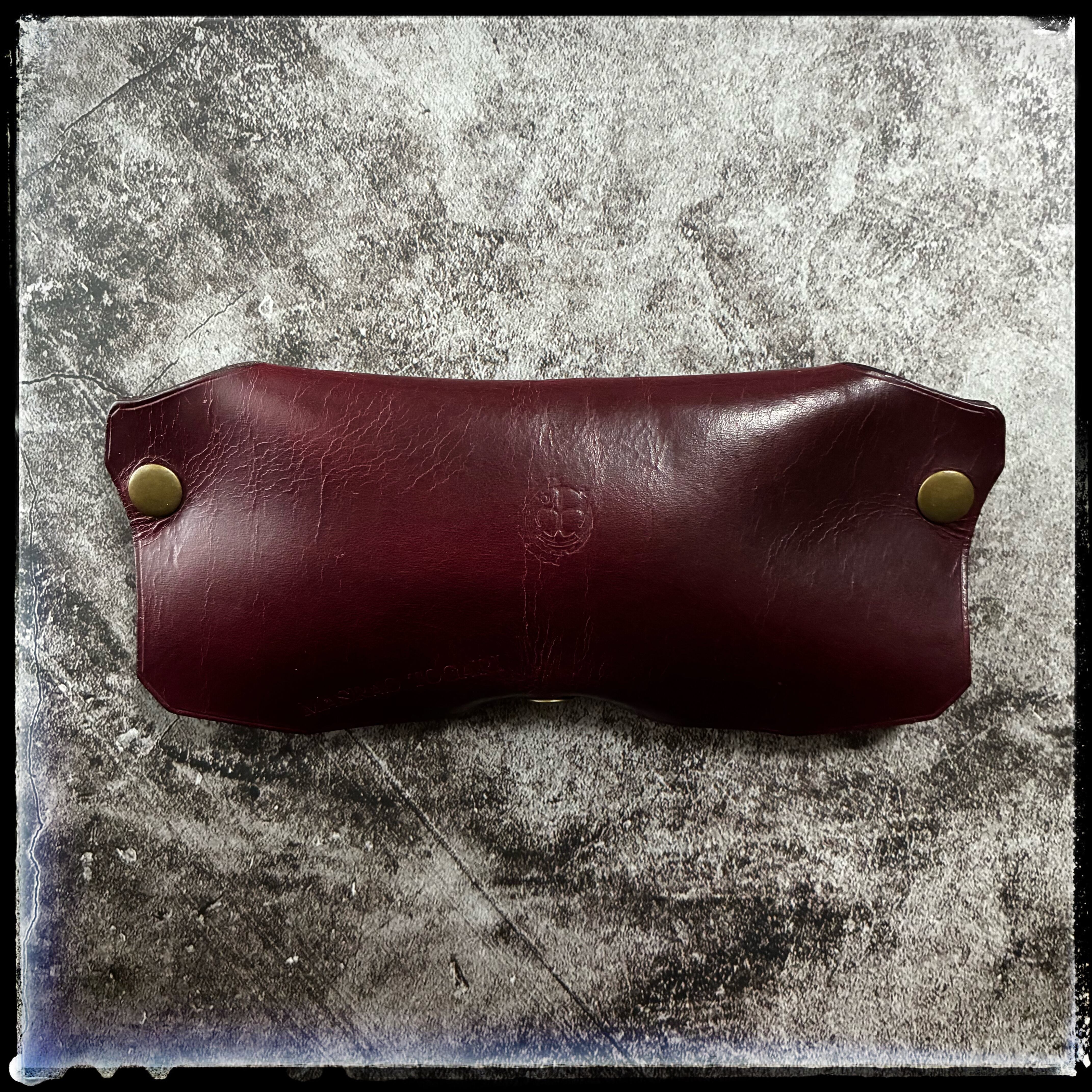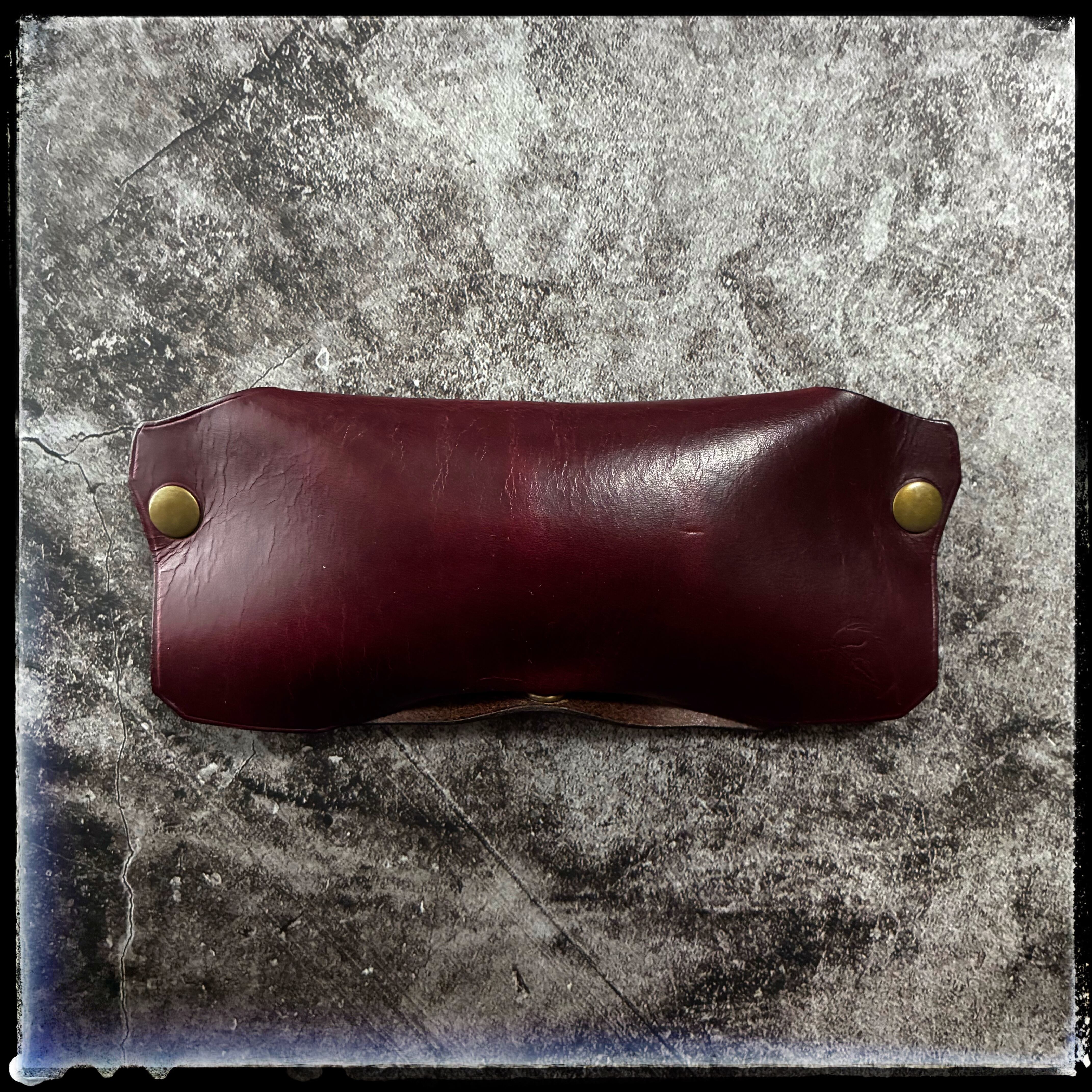 カラーは、大人っぽいワインレッドの様な、少し紫も入っている様な、アズキ色の様にも見える、とても奥深い大人っぽいカラーとなります。床面(革の裏)はブラウンです。